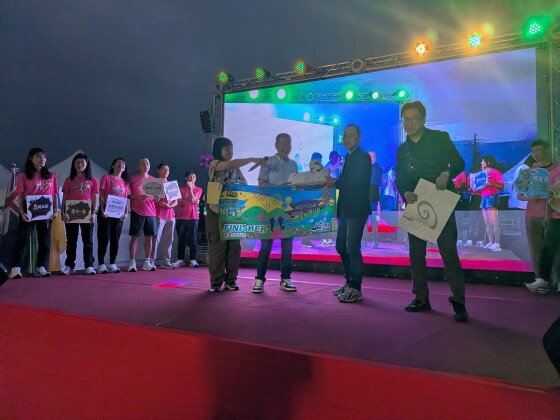 前日は、スタート・フィニッシュ会場の武昌宮前でウェルカムパーティー。主催者や開催自治体関係者との交流がありました。舞台では、集集鎮長(鎮=台湾の行政区)と記念品を交換。奈良マラソンからの招待選手の紹介をしていただきました。他にも28の国・地域から参加している海外選手が参加。歌やダンス、花火など、にぎやかな催しとなりました。
